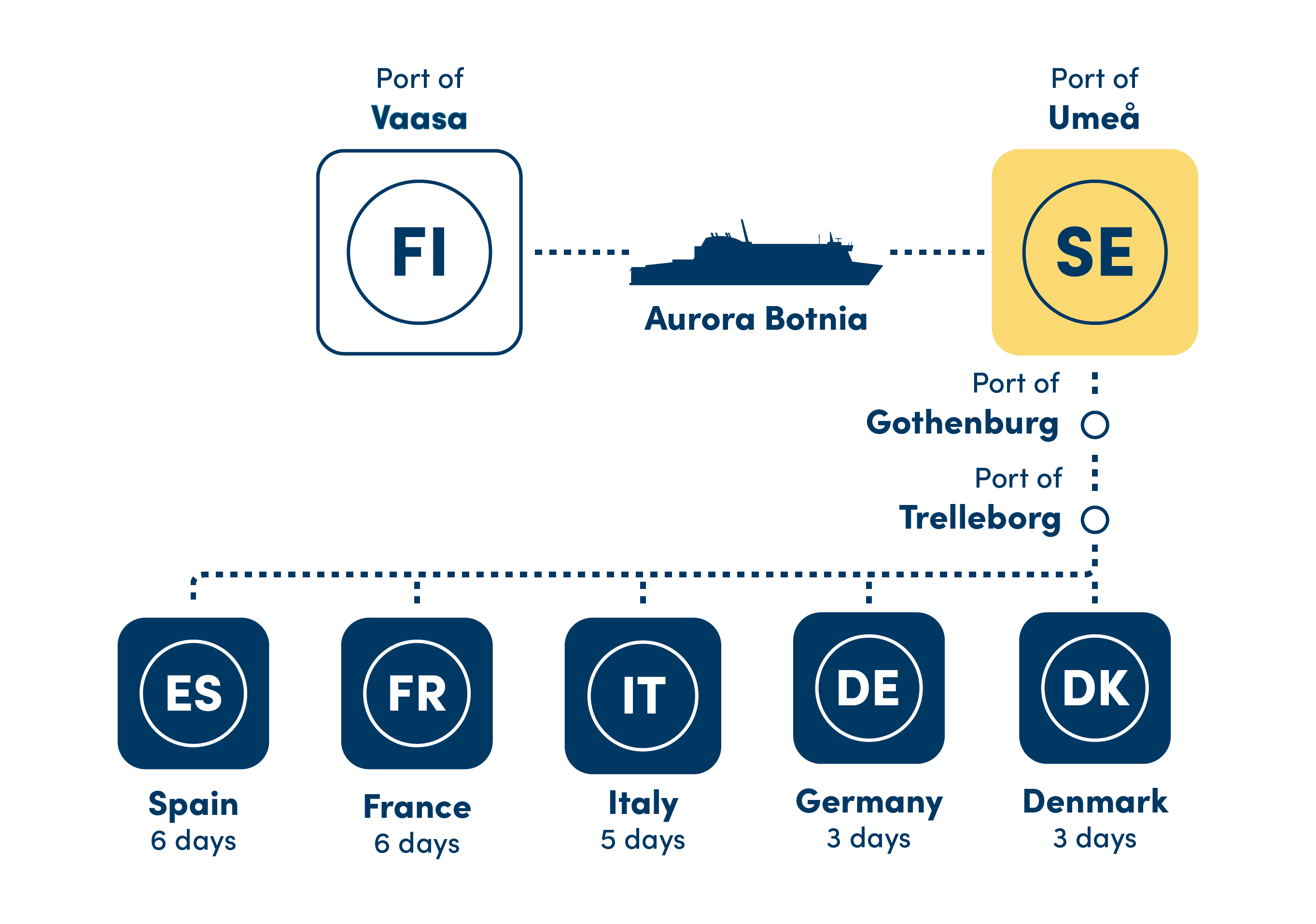 Ledtiden till Barcelona är ca 6-7 dagar och utsläppen är upp till 80 % mindre än att transportera det med lastbilstransport och med ett Roro fartyg upp till södra Finland från Tyskland (källa NTM-calc).
